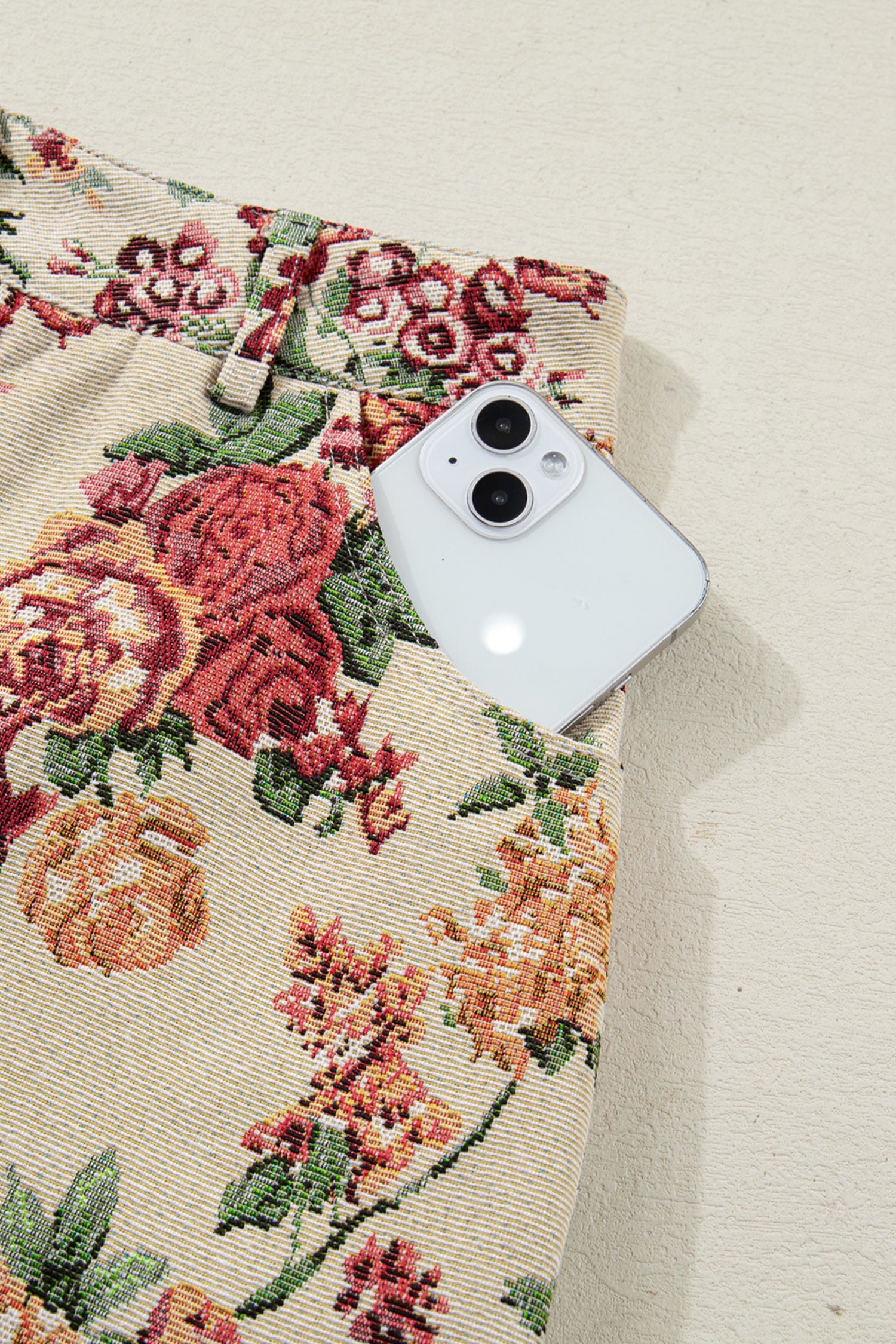 Apricot Buttoned Front Scalloped Trim Mini Jacquard Floral Skirt
