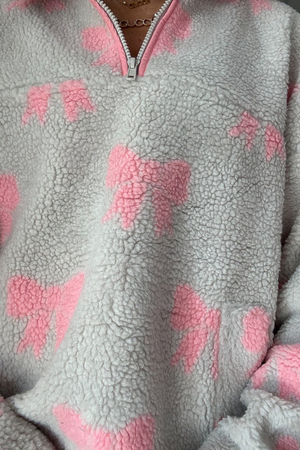Gray Quarter Zip Bow Pattern Sherpa Baggy Sweatshirt
