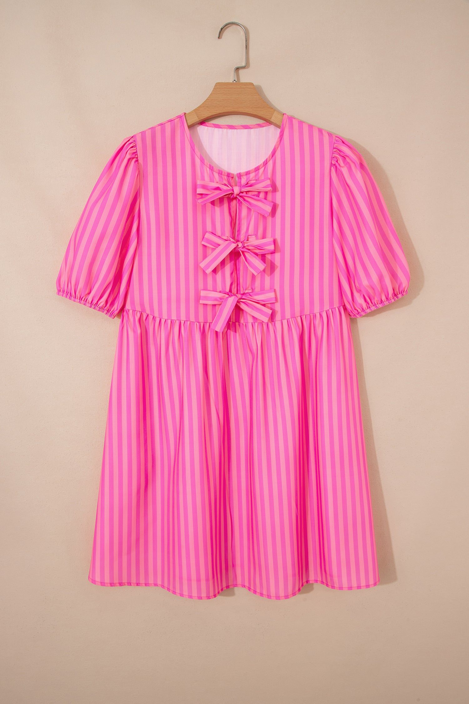 Rose Striped Print Bow Detail Short Puff Sleeve Mini Dress