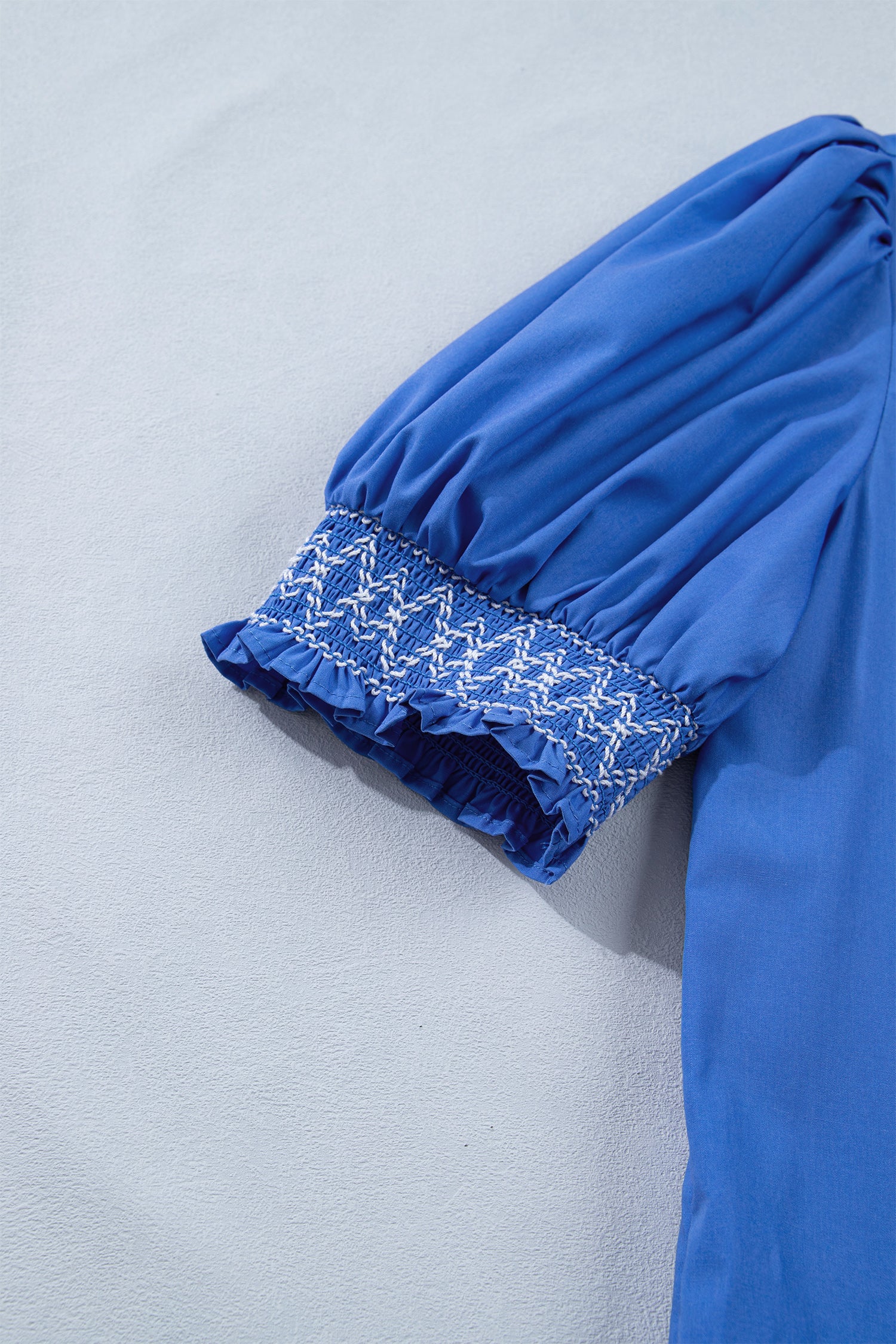 Sky Blue Embroidered Smocked Detail V Neck Short Puff Sleeve Mini Dress