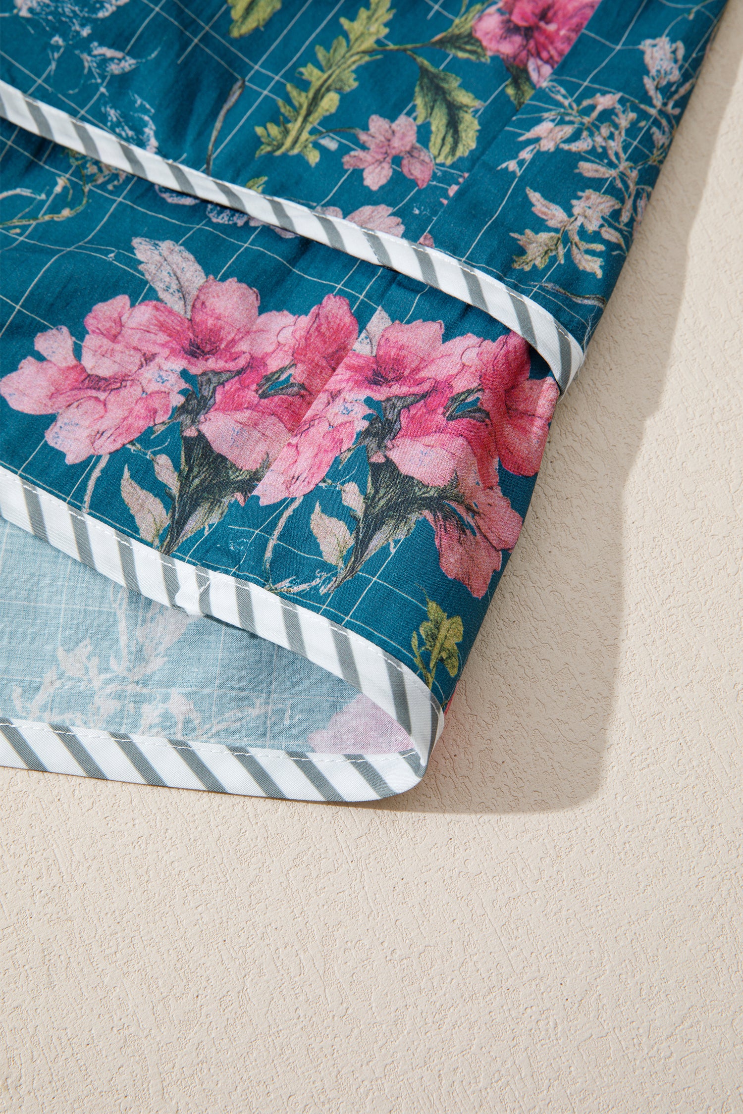 Contrast floral yoke with tie detail and striped binding trim.