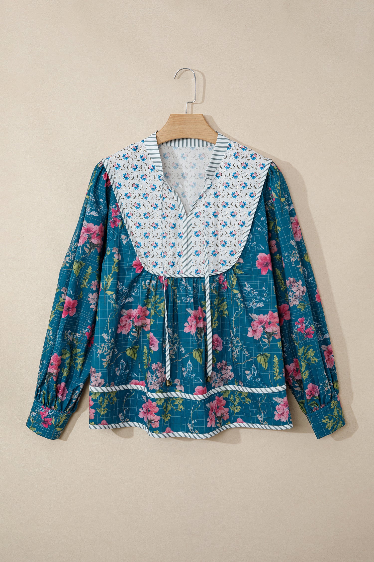 Sky Blue Floral Print Contrast Yoke Patchwork Striped Trim Long Puff Sleeve Blouse